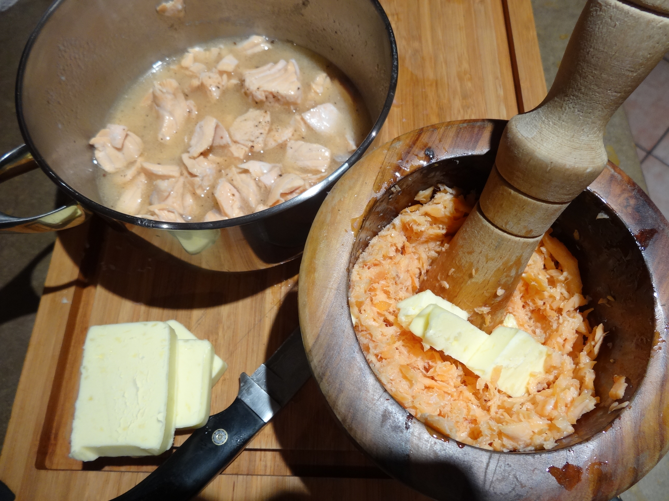 Quand il est à température ambiante, mettez le dans un mortier, puis incorporez petit à petit le beurre jusqu’à obtenir un mélange homogène. Ajoutez alors le saumon frais cuit dans le vin blanc et continuez à mélanger.